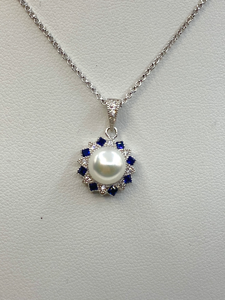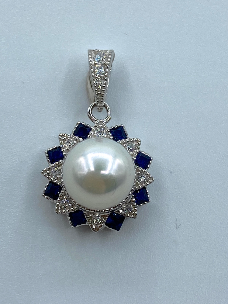 Exkluzív megjelenésű ezüst medál, édesvízi tenyésztett gyönggyel, fehér cirkónia és mélykék szintetikus zafír kövekkel díszítve.